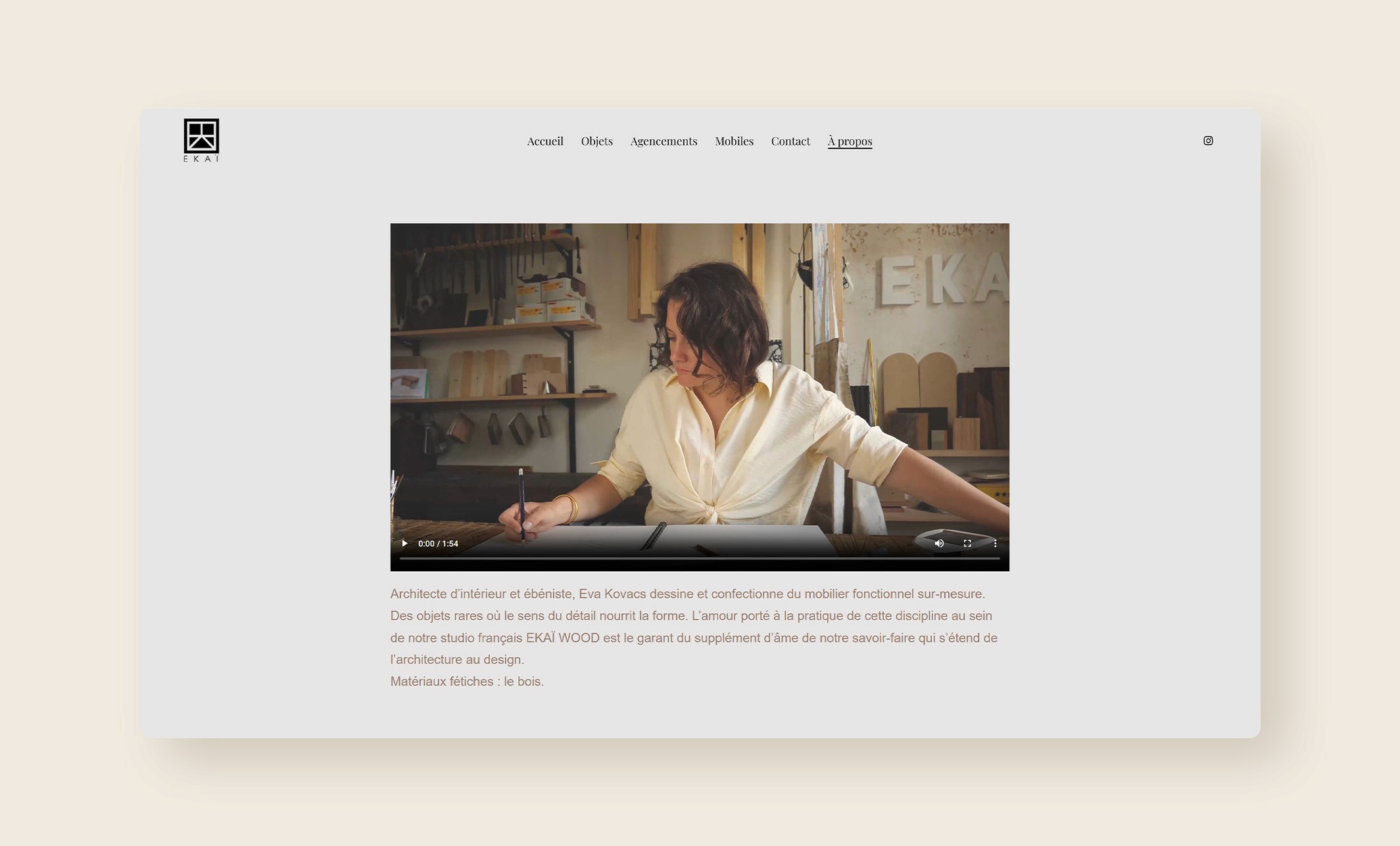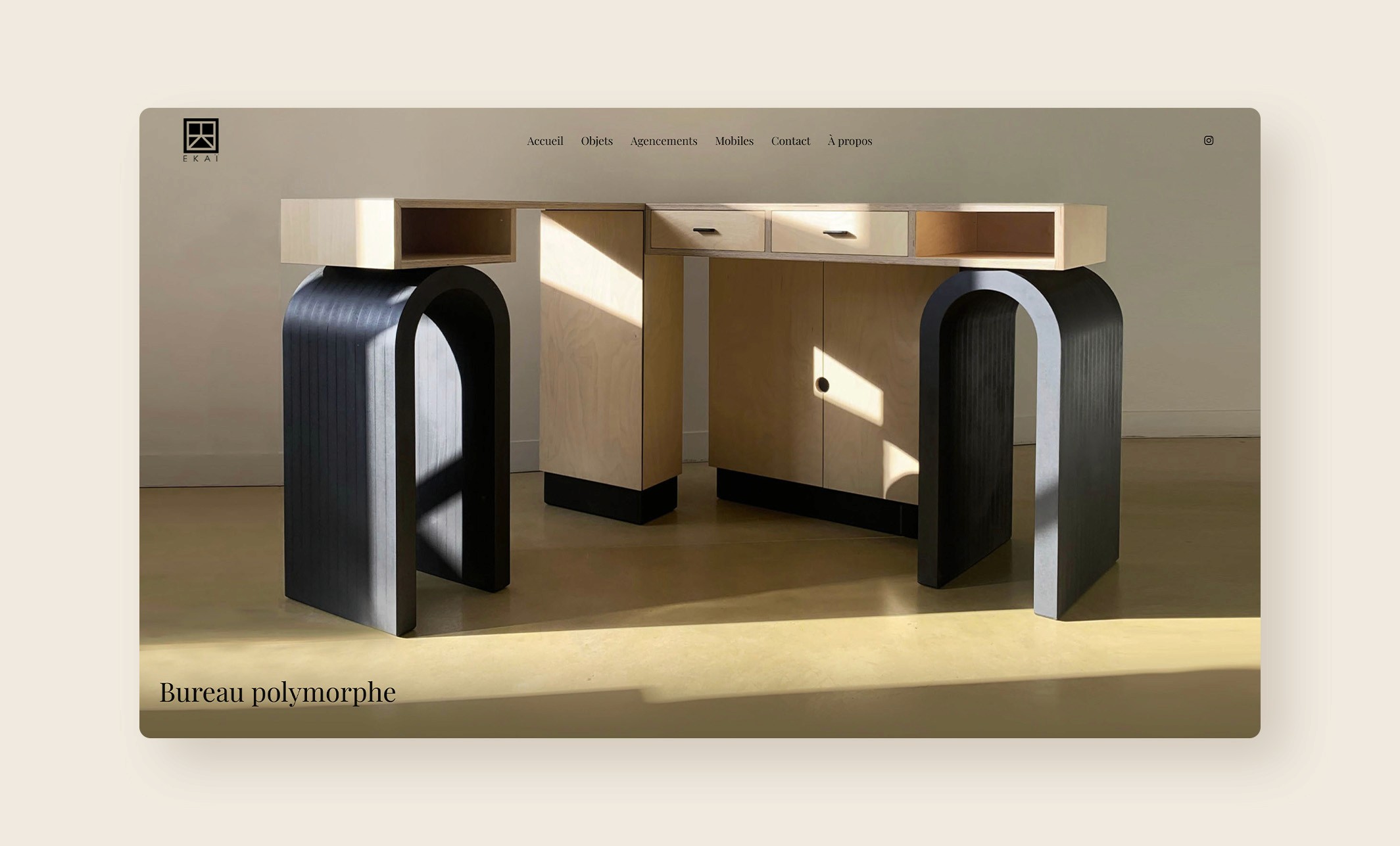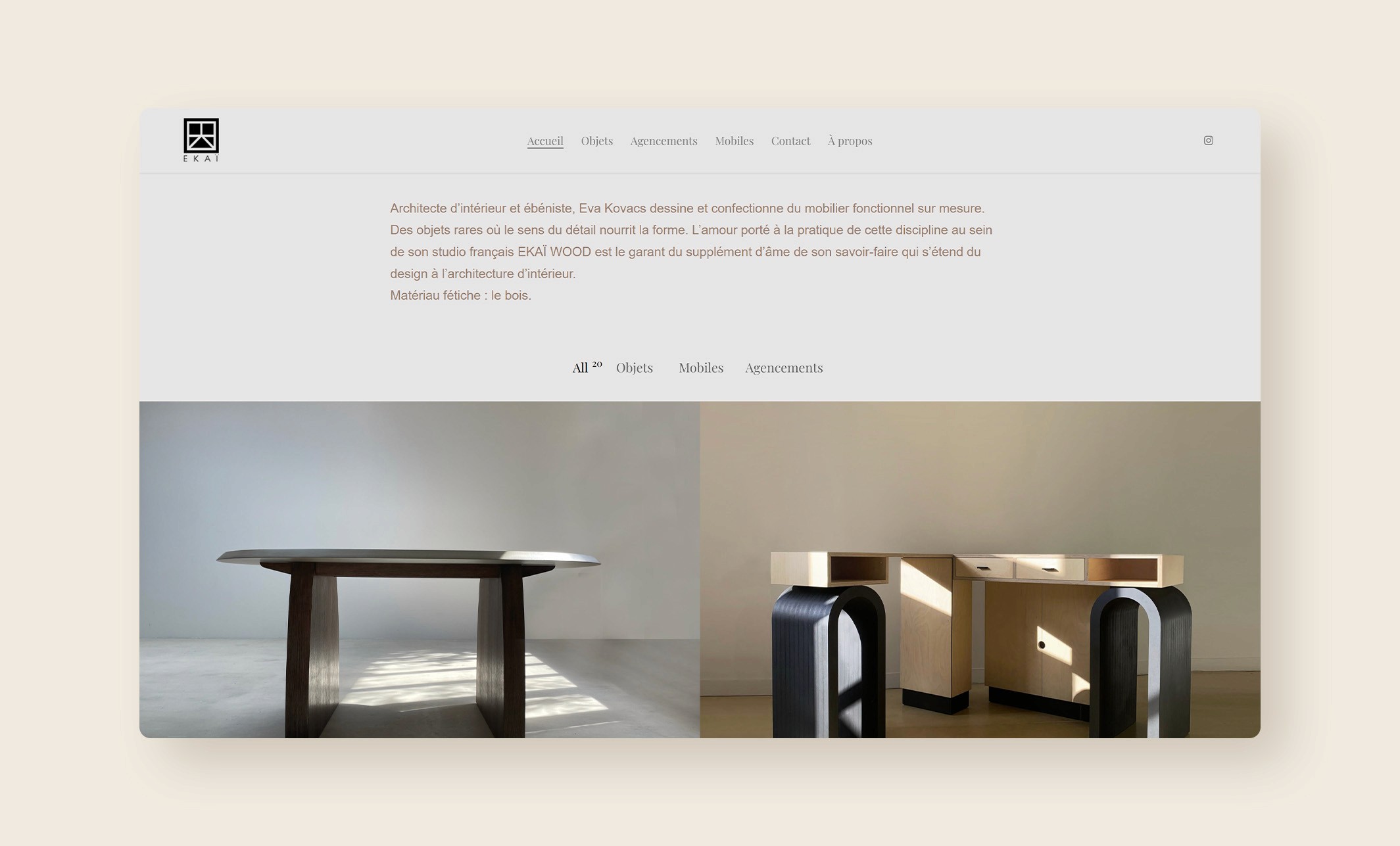 J’ai été chargé de concevoir le site vitrine d’Ekaï Wood afin de mettre en valeur les créations du studio et de traduire visuellement ses valeurs : authenticité, élégance et savoir-faire artisanal. Réalisé sous WordPress, le site reprend les codes de la direction artistique développée par Eva Kovacs pour le studio, adaptés à un environnement digital sobre et raffiné.