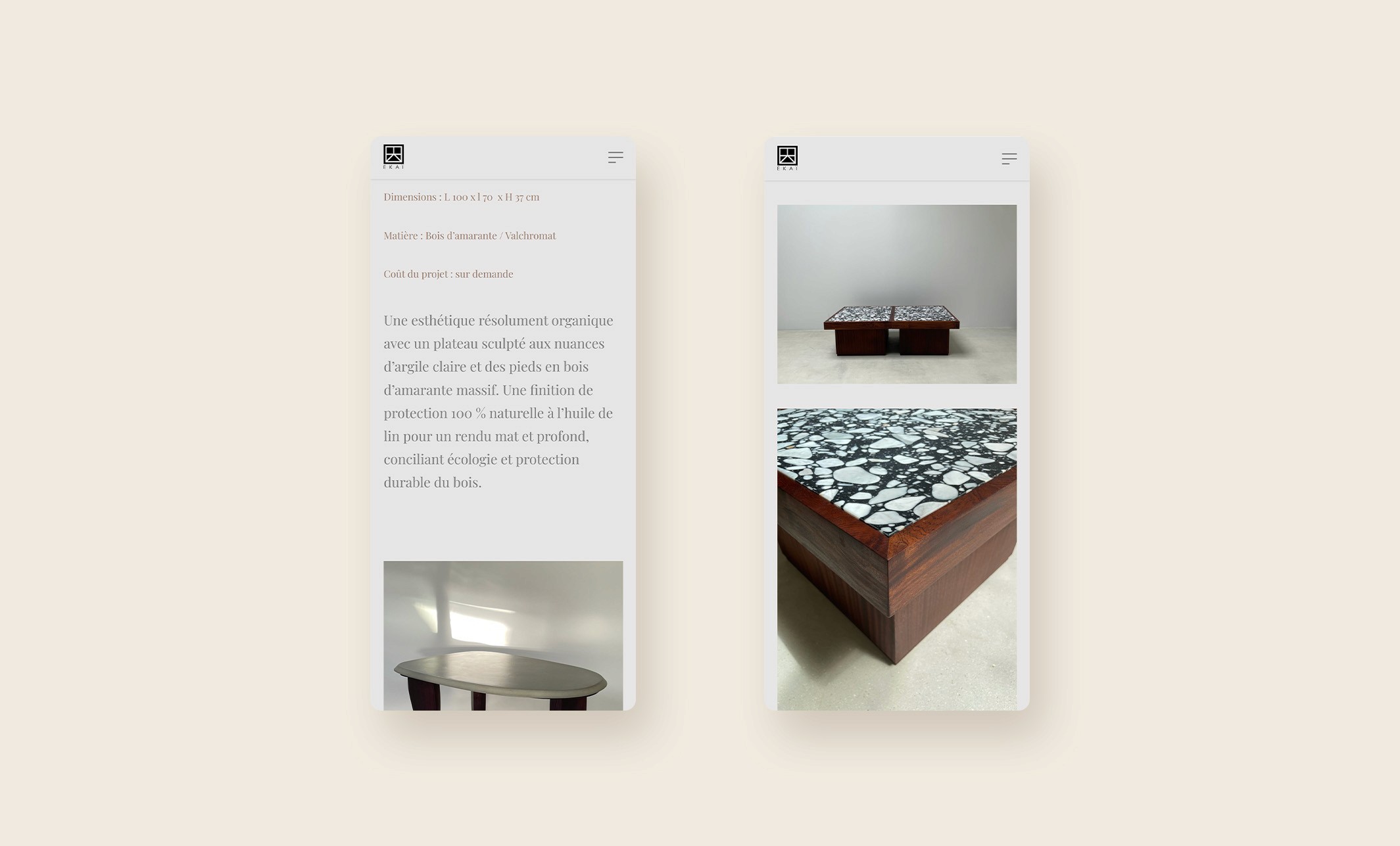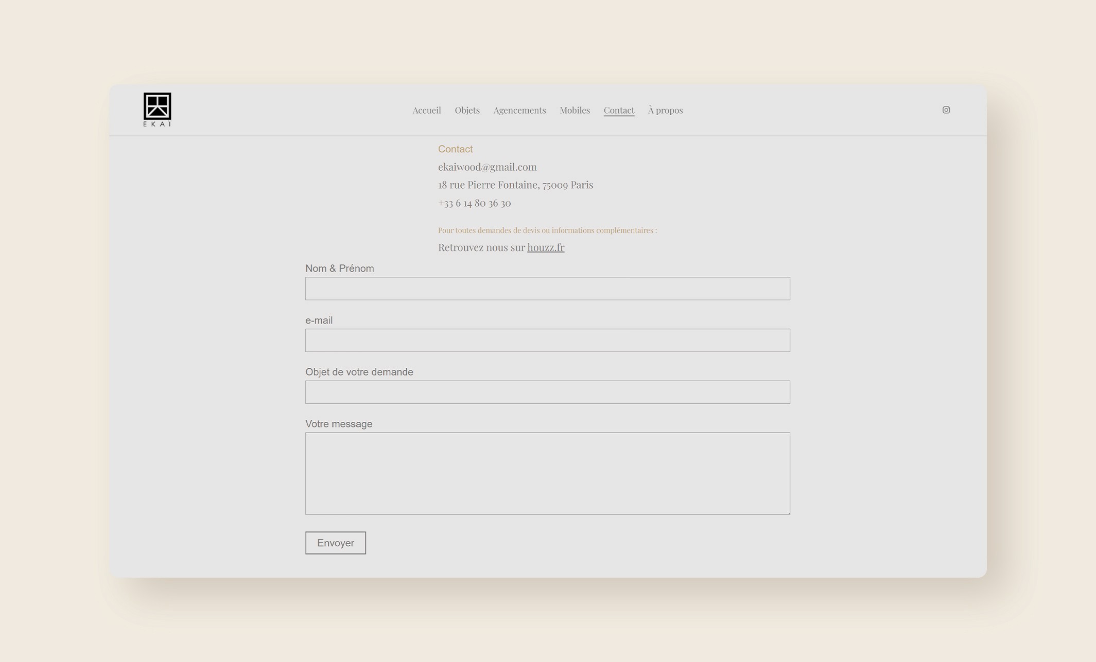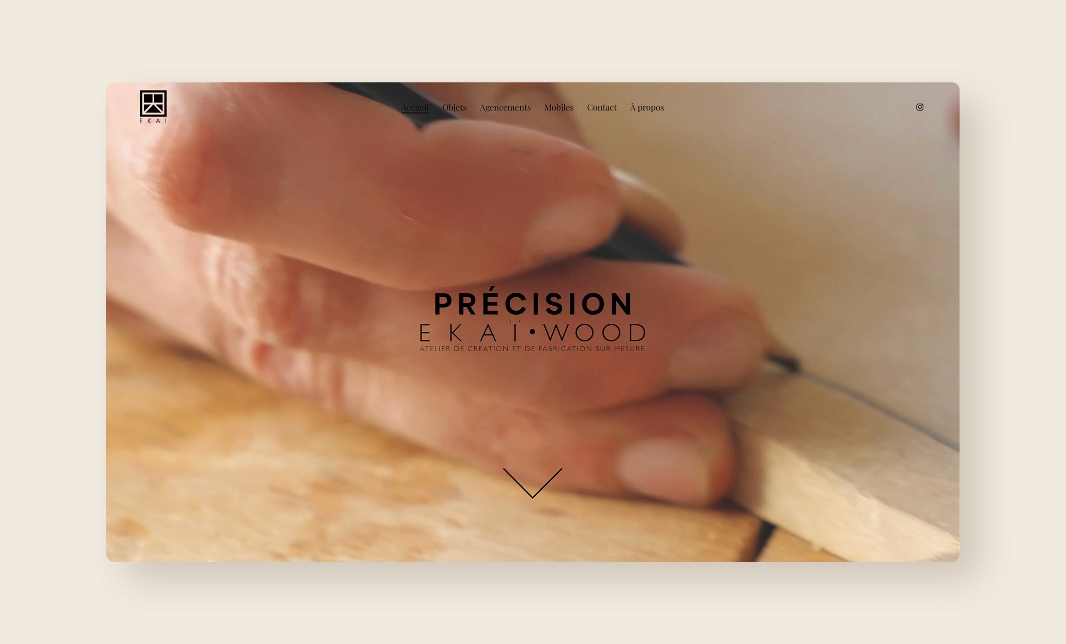 J’ai été chargé de concevoir le site vitrine d’Ekaï Wood afin de mettre en valeur les créations du studio et de traduire visuellement ses valeurs : authenticité, élégance et savoir-faire artisanal. Réalisé sous WordPress, le site reprend les codes de la direction artistique développée par Eva Kovacs pour le studio, adaptés à un environnement digital sobre et raffiné.