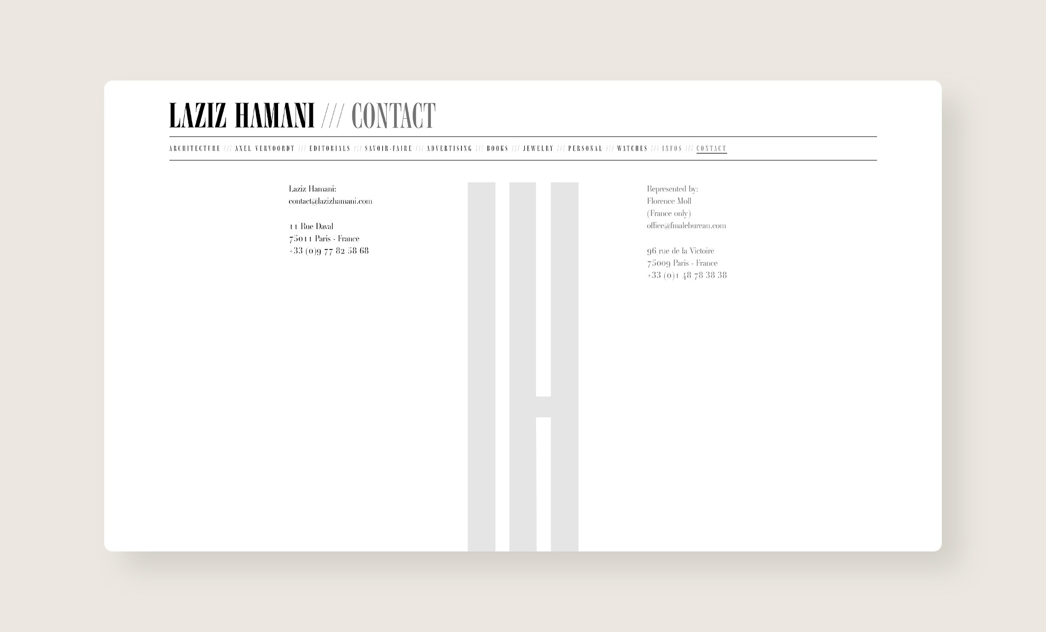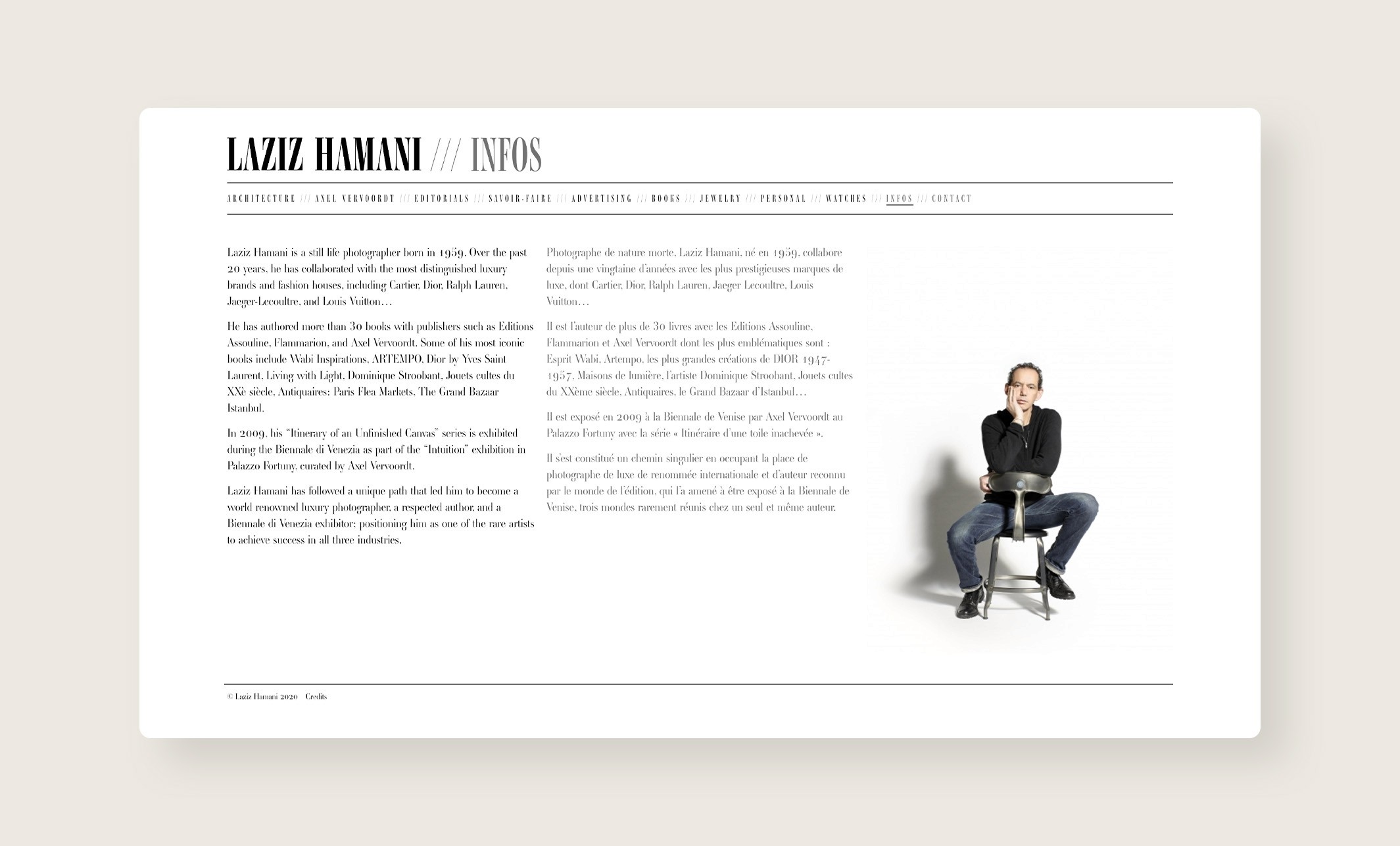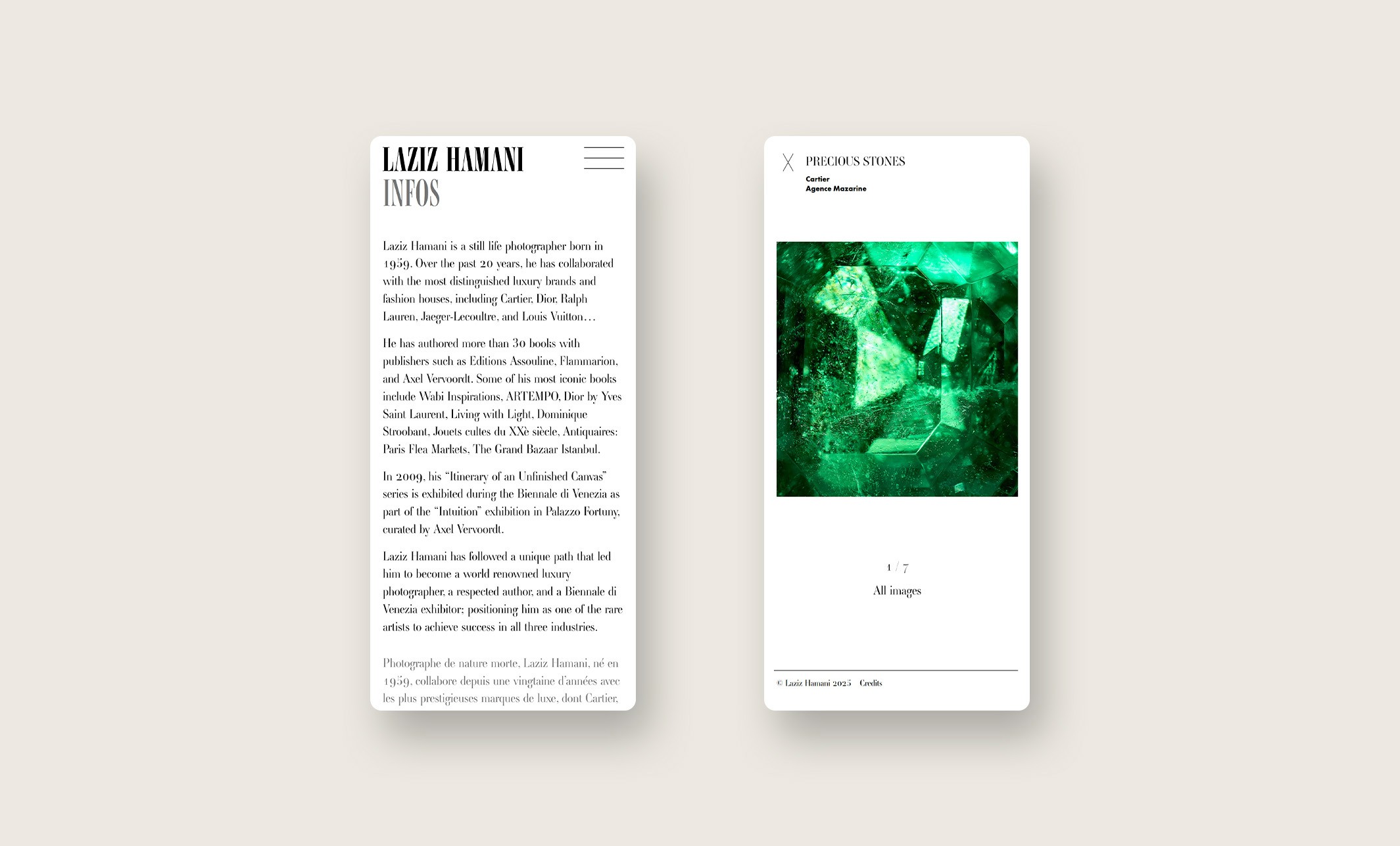 J’ai eu l’occasion d’intervenir aux côtés de Ben Wrobel pour la refonte de l’identité visuelle et du site internet de Laziz Hamani. Ce projet a permis de moderniser et d’harmoniser sa présence en ligne, en valorisant son travail photographique par une approche graphique sobre et élégante, respectueuse de son univers artistique.