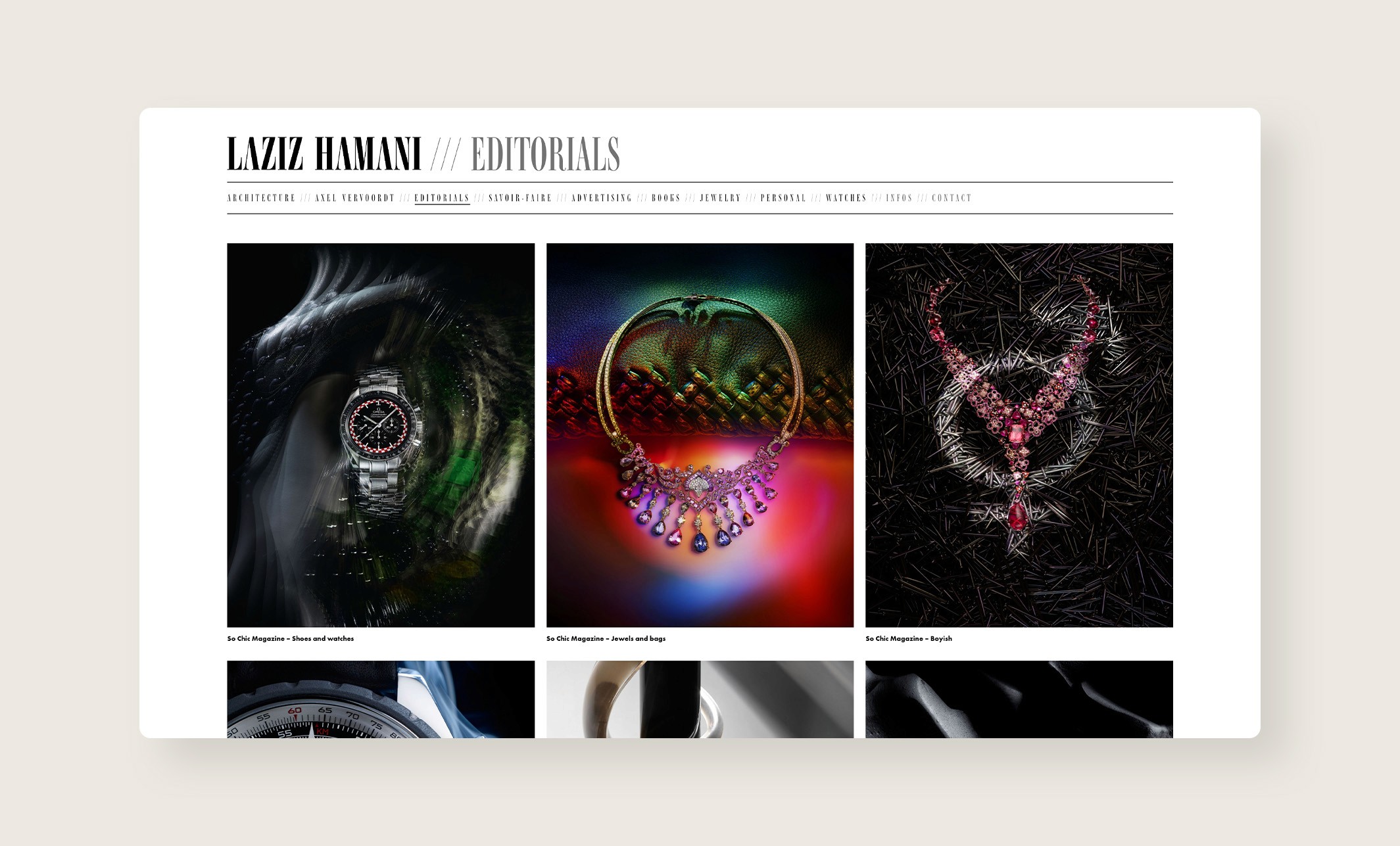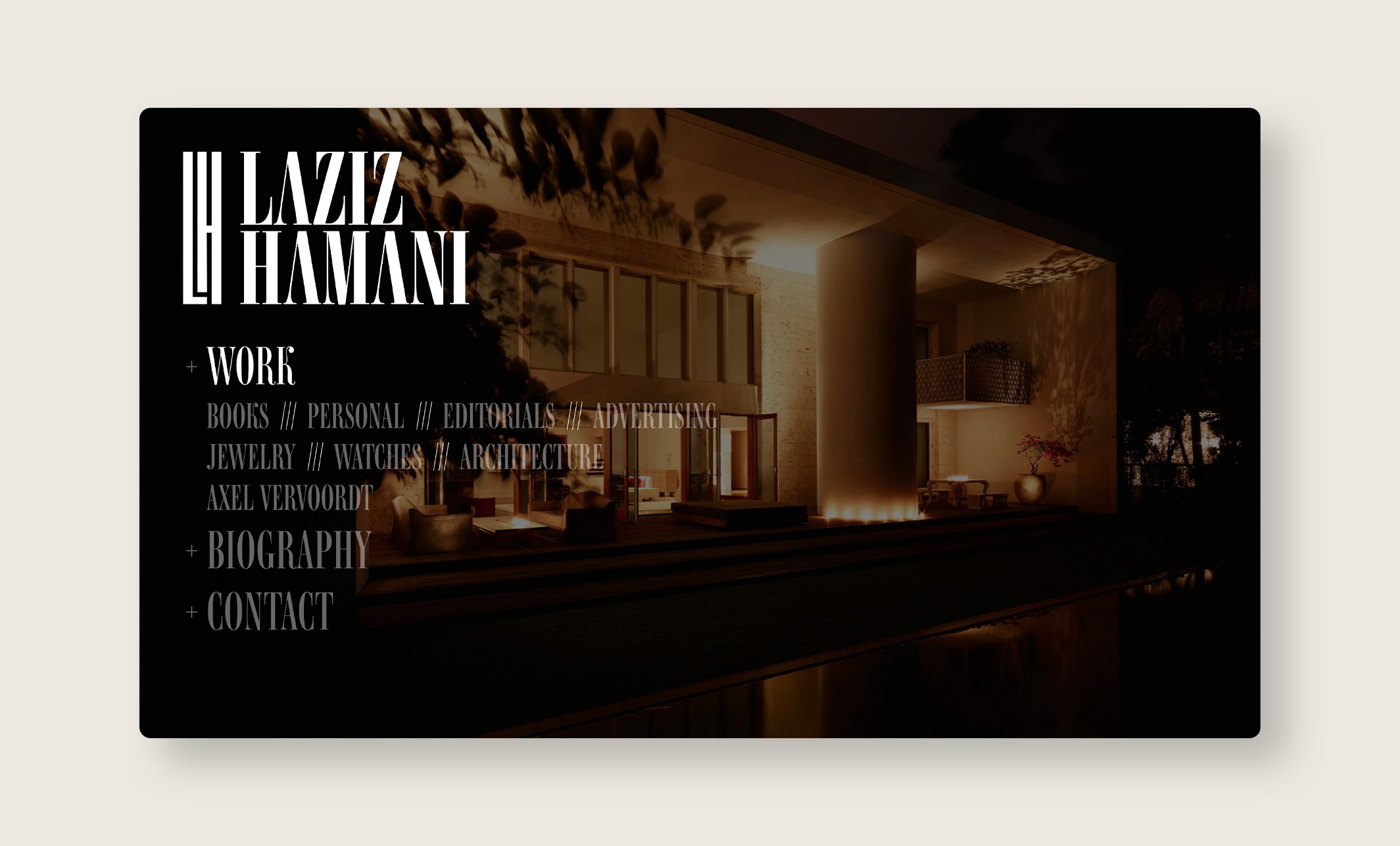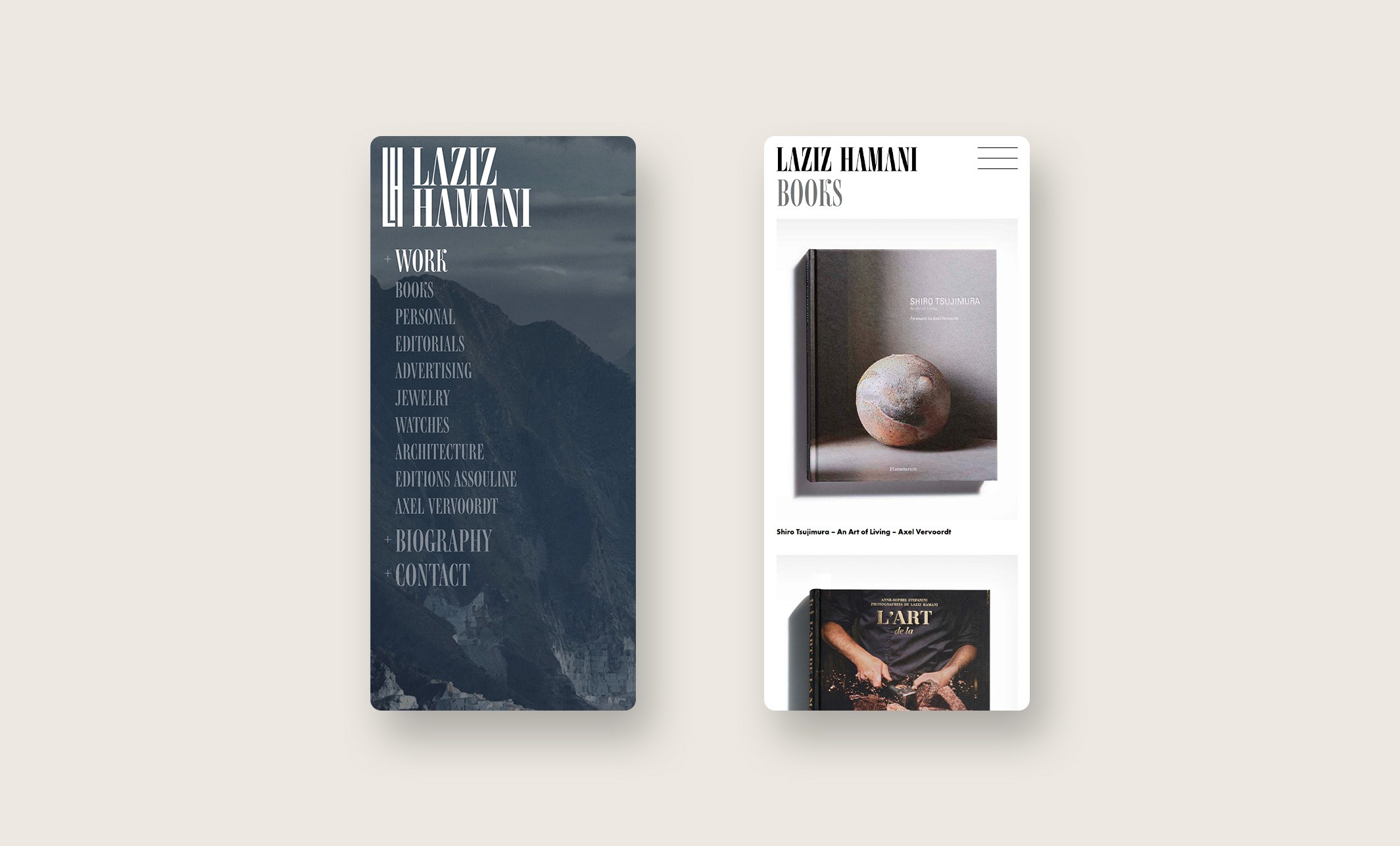 J’ai eu l’occasion d’intervenir aux côtés de Ben Wrobel pour la refonte de l’identité visuelle et du site internet de Laziz Hamani. Ce projet a permis de moderniser et d’harmoniser sa présence en ligne, en valorisant son travail photographique par une approche graphique sobre et élégante, respectueuse de son univers artistique.